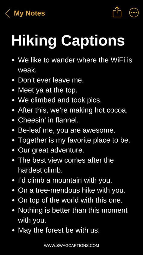 When choosing a hiking insta caption, consider using descriptive language that paints a vivid picture in the reader's mind. Use words that evoke the senses, such as "crisp mountain air," "whispering pines," or "sun-kissed meadows." This will help to transport your followers to the hiking trail and make them feel like they're right there with you.